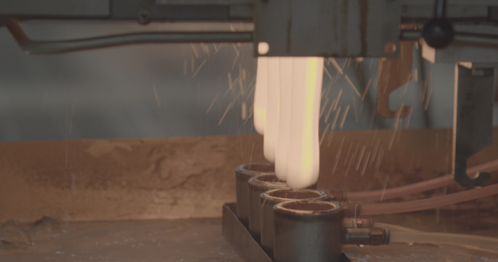 从熔炉中取出熔融玻璃,均匀冷却后切割成“凝块”, 经过导料管进入料杯,再由分料器按一定顺序准确、快速地分配到行列式制瓶机各机组,经过直槽、转向槽进入初模。